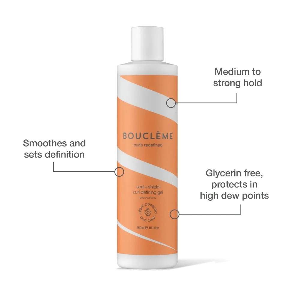 Bouclème Seal + Shield Curl Defining Gel is een sterke gel zonder glycerine. Deze gel geeft je krullen weerbestendige definitie en glans! Bevat een voedende formule met plantaardig suikercomplex dat zorgt voor glanzende krullen, die heel lang meegaan.